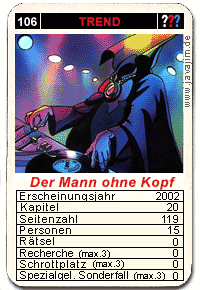 Bei der Folge "Der Mann ohne Kopf" kann jedem Leser nur geraten werden, der Stimme des unbekannten Anrufers aus dem "Gespenster- schloss" zu folgen: Weg bleiben! Weg bleiben! Leider kann sich Peter zu Beginn des Falles mit seiner Behauptung, dass der Teufels-DJ kein Fall ist, nicht durchsetzen. Die drei ??? gehen in die Diskothek "Planet Evil". Justus überzeugt Peter mit dem Grundsatz "Wir übernehmen jeden Fall". Doch ich muss nicht jeden Fall lesen. Nachdem eine alte Disco-Oma an Ectasy stirbt und auf Seite 51 klar ist, dass der Star-DJ aus Las Vegas mit unerhörbaren Subbässen die Hörer willenlos macht, sagt mein analytischer Verstand: Jetzt reicht es, ich warte auf das Hörspiel.