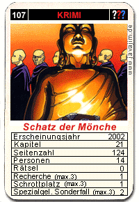 Der Fall geht sofort temporeich los. Peter gerät in einer alten Fabrikhalle in Gefahr, als er ein geheimnisvolles Schatzkästchen findet. Er wird von einem messerverwerfenden Asiaten verfolgt und kann wegen seiner Inline-Skates und der Mithilfe von Morton auf den Schrottplatz zu Justus und Bob flüchten. Zusammen versuchen Sie das Geheimnis des buddistischen Kästchens zu lüften. Doch dazu kommen sie kaum. Ständige Verfolgungsjagden durch Rocky Beach, immer neue Wendungen und der Erzfeind Skinny Norris halten die drei ??? und die Leser ständig auf Trab. Dieser spannende Fall wird durch nette Details, der Beteiligung von Skinny und Morton und einer stimmigen Nebenhandlung zu einer sehr guten Folge.