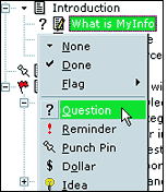 Das Tool hat eine leicht zu bedienende Benutzeroberfläche. Die einzelnen Funktionen und Verwendungsmöglichkeiten lassen sich in dem kurzen "Beginner's tutorial" und der Hilfedatei schnell nachschlagen. Durch die Baumstruktur lassen sich die gesammelten Ideen leicht überblicken. Um sich in seinen Gedanken-Splittern noch besser zurecht zufinden, kann man den Einträgen verschiedene Icons zuordnen. Offene Fragen werden mit einem Fragezeichen markiert, wichtige Punkte mit einem Ausrufungszeichen und Ideen mit einer Glühbirne. Hat man etwas erledigt, bekommt die Notiz ein Häkchen.