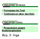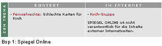 Die Auslagerungen, egal ob in Kästen, in einer Randspalte oder am Fuß der Seite, sollten so gestaltet sein, dass die Trennung zwischen externen und internen Links klar ist. Dies kann durch eine zusätzliche Überschrift, Grafik oder ein Icon geschehen. Beim Labeling sollte man gewährleisten, dass die Betitelung der Auslagerung logisch und allein verständlich ist. So wird beispielsweise durch die von "Spiegel-Online" verwendete Formulierung "Im Kontext" nicht klar, ob es sich um ein Auslagerung von externen oder internen Links oder gar beiden zusammen handelt. Die Bedeutung als Markierung für interne Links wird erst durch das zweite Auslagerungselement "Im Internet" klar. Doch tritt "Im Kontext" auch alleine auf.